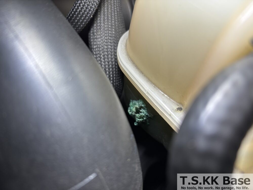 漏れ部を拡大した写真が以下の写真です。漏れ出た冷却水が固まって結晶化していました。