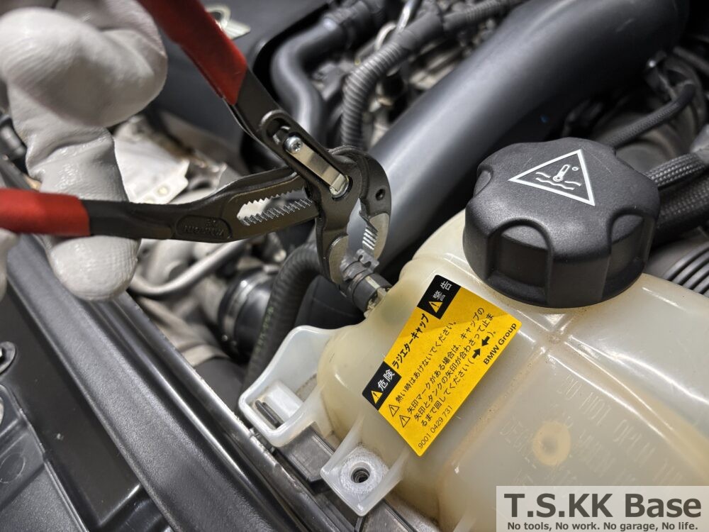 KNIPEX(クニペックス)のCOBRAを使用してホースを固定しているαクランプを摘んでずらします。