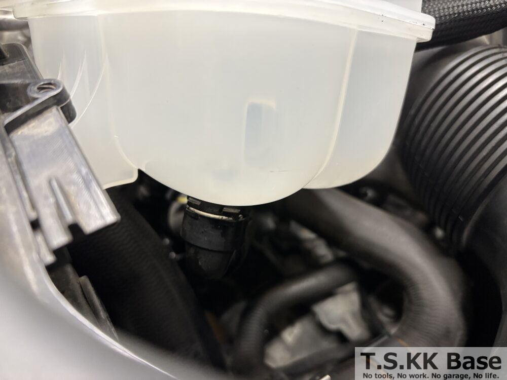 リザーバータンクの真下にあるロックピンを引き抜くために周辺部品を取り外して作業スペースを確保します。なお、ロックピンを周辺部品を取り外さずに無理やり外そうとするとホースの接合部に負荷が掛かり樹脂製のジョイントが折れるなどの二次不具合に繋がる可能性がありますので無理をせず周辺部品を取り外して作業しましょう。