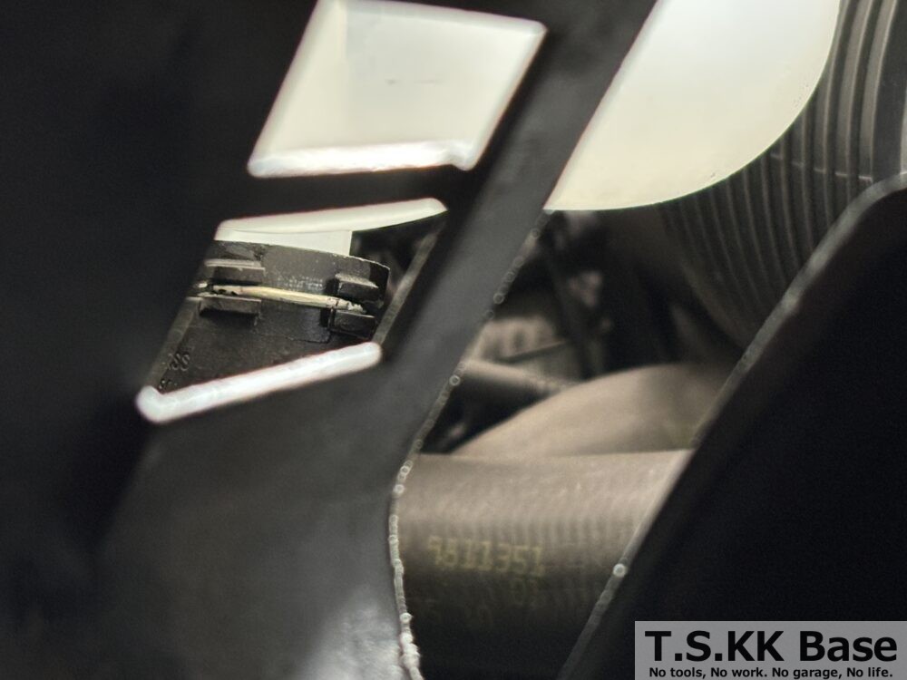 助手席側のヘッドランプ横にあるエアダクトの嵌合を外してエアダクトを少し車両後方に引き抜き、リザーバータンクのロックピンにアクセスできるようにします。