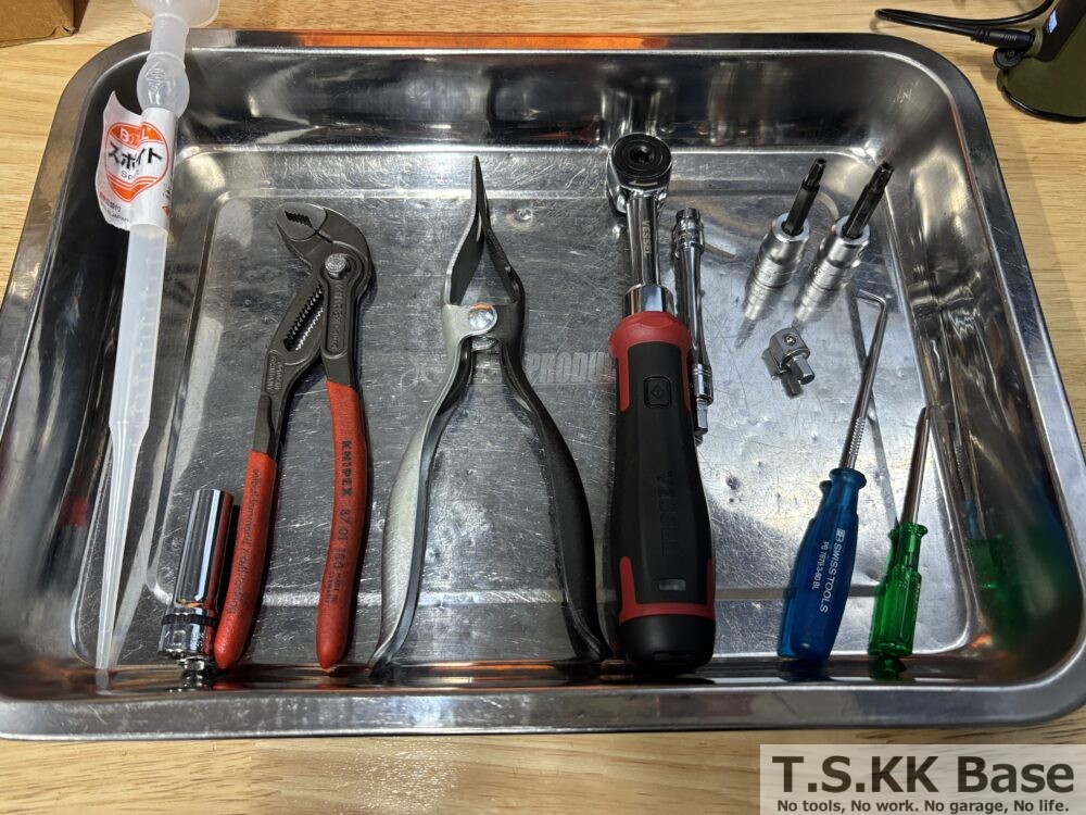 今回の修理で使用した工具は以下の写真の通りです。工具の詳細については作業紹介の中で順に解説します。